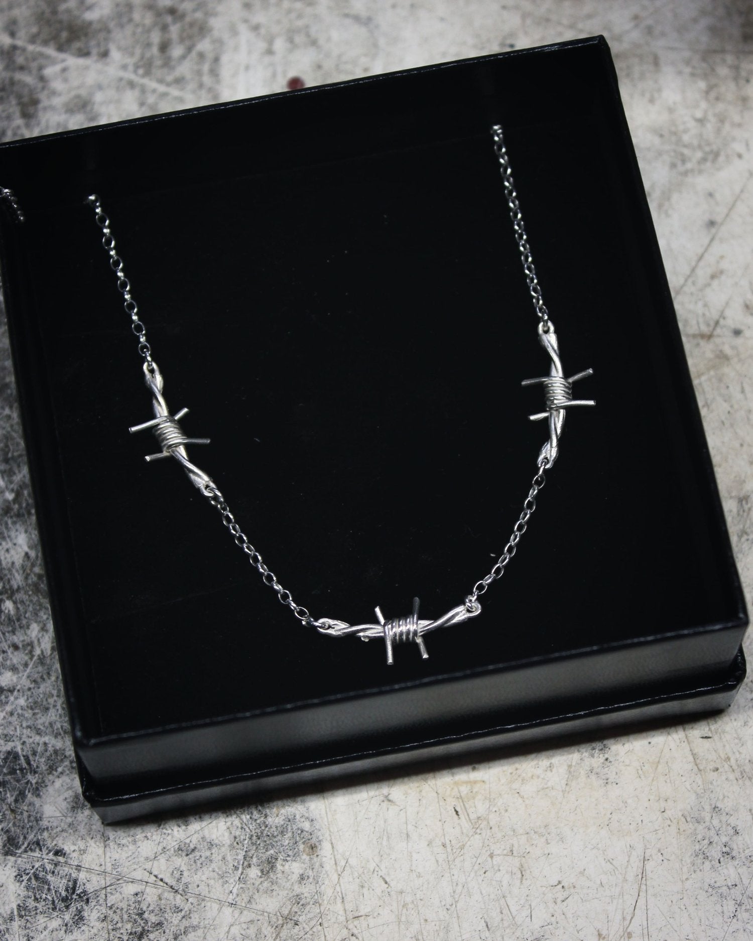 This Barbed Wire Chain is crafted by hand, with three solid sterling silver barbs strung on a sterling silver belcher chain. A gold vermeil option (gold plated sterling silver) is also available. The chain length pictured is 42cm (silver) and 50cm (gold); custom options are available via email: info@electric-sun-store.com