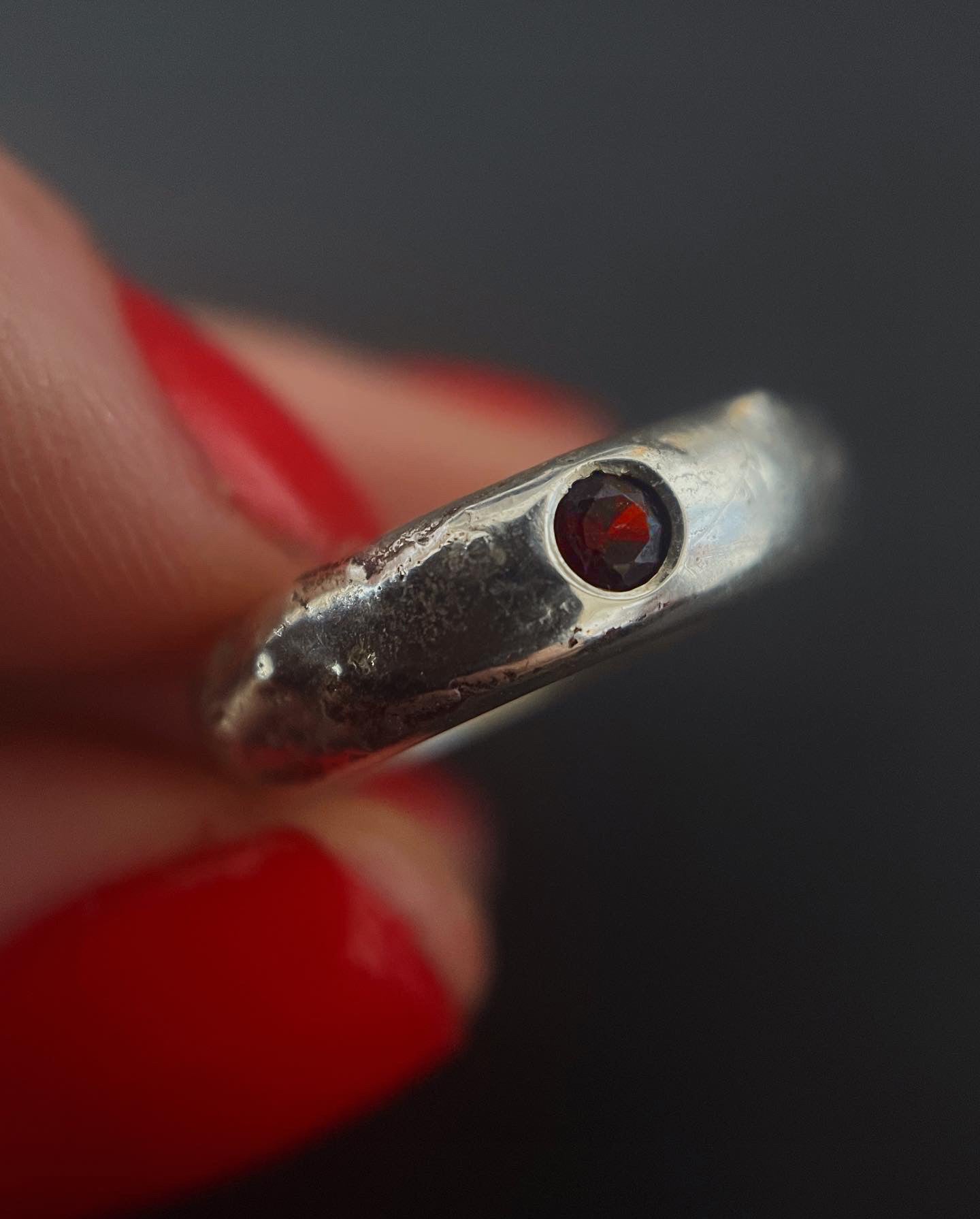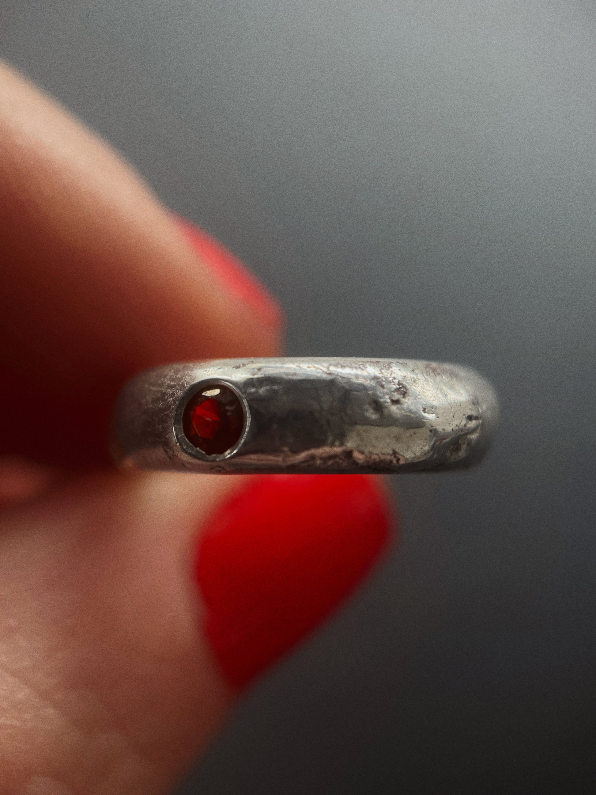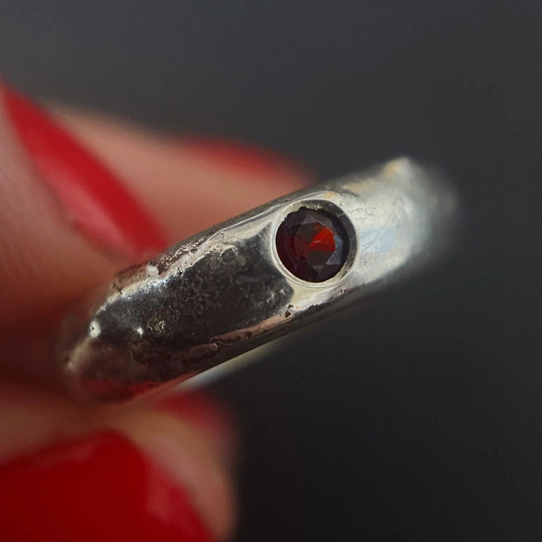 The "Django" Band is handcrafted from 100% recycled sterling silver and set with 3mm Garnet; equal parts modern statement and a relic that could belong to any era.