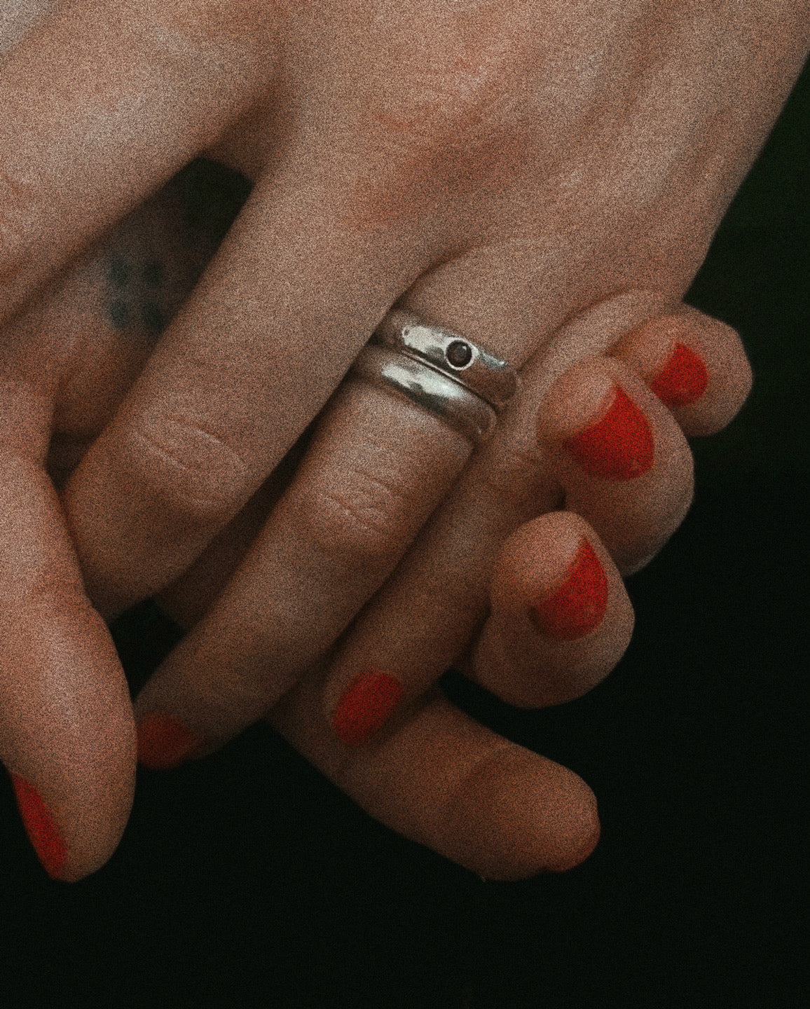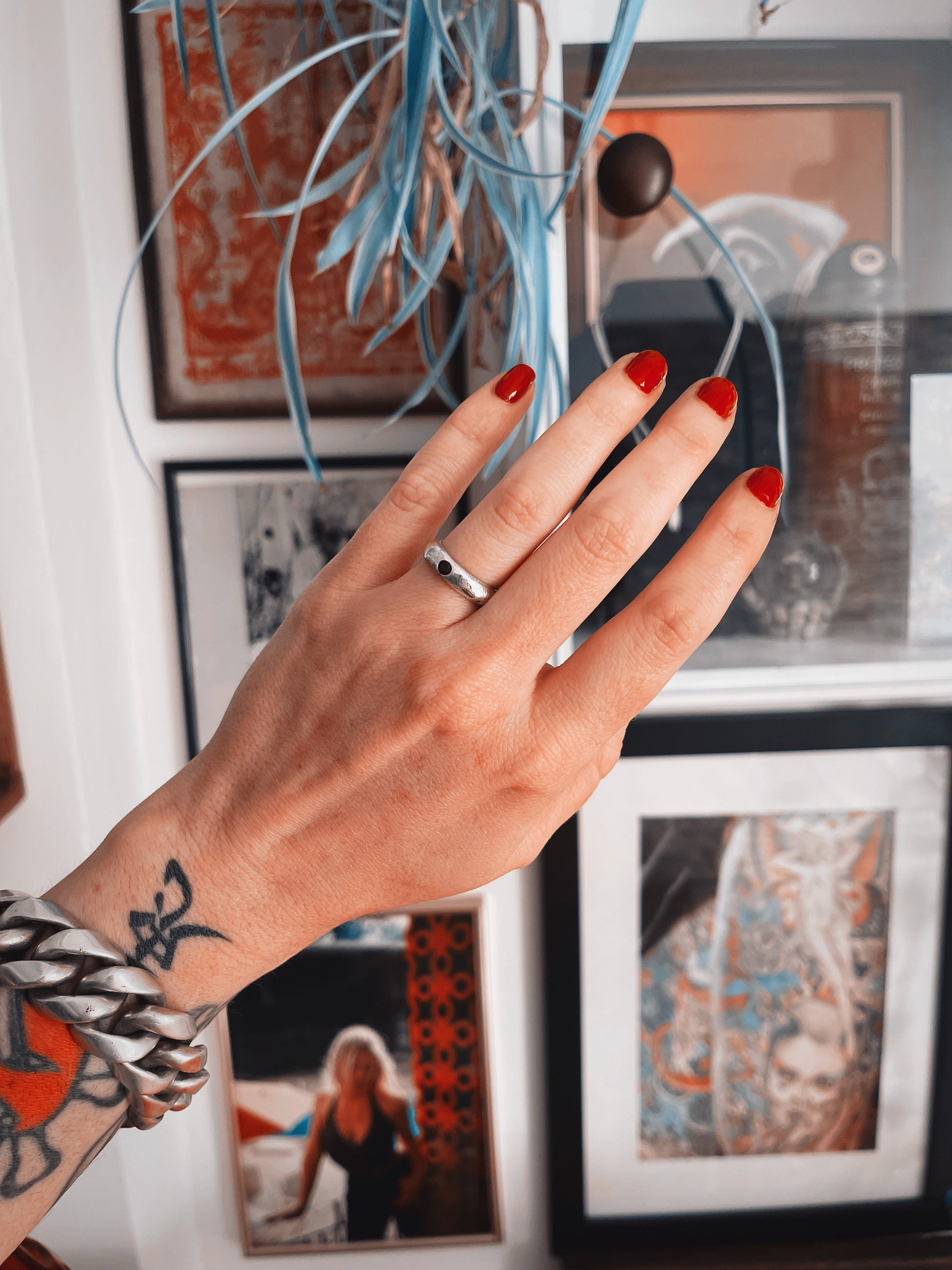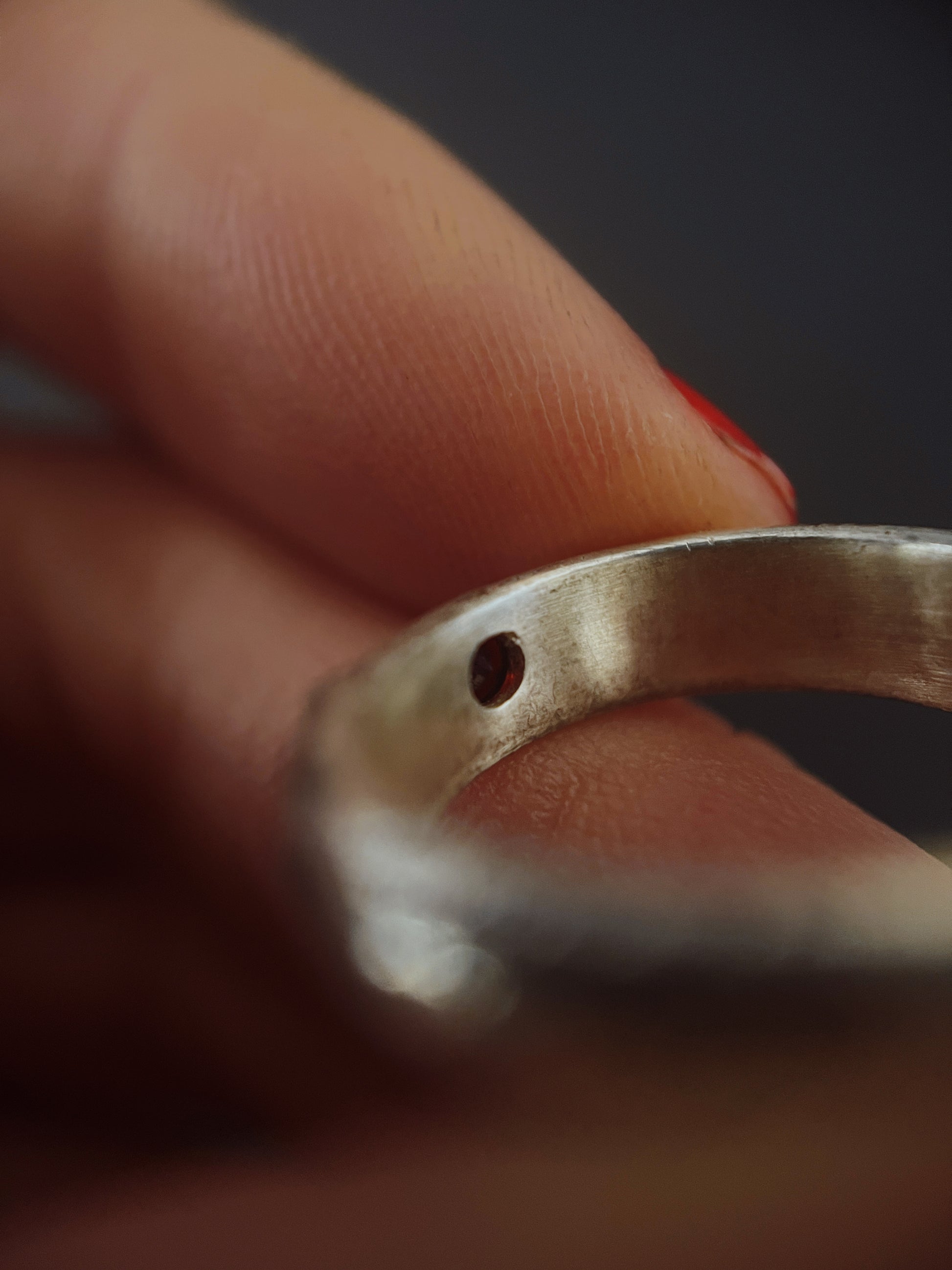 The "Django" Band is handcrafted from 100% recycled sterling silver and set with 3mm Garnet; equal parts modern statement and a relic that could belong to any era.