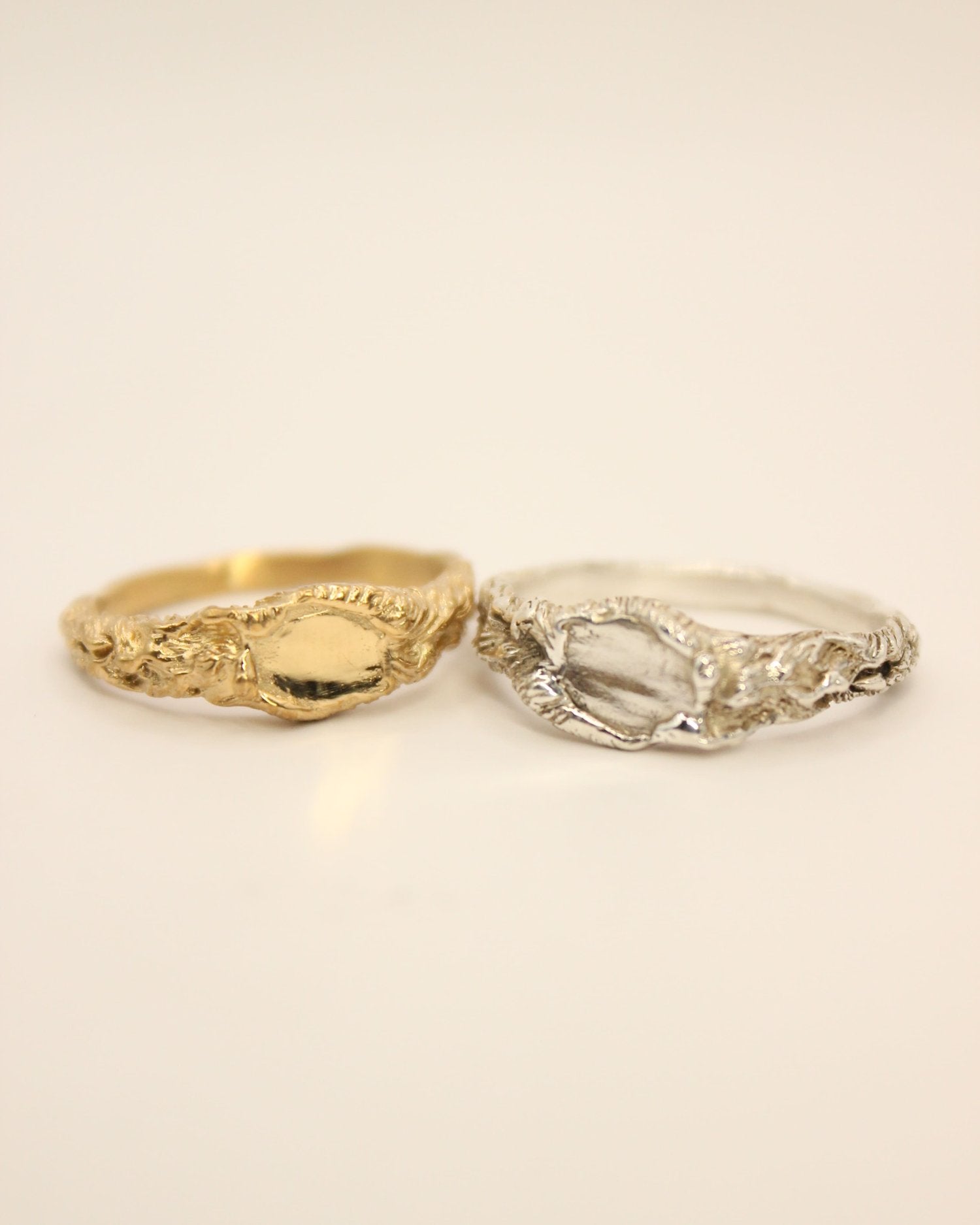 Available in both sterling silver and solid 9ct yellow gold. The face of the ring measures 7mm at the widest part, tapering to a 2mm wide and 2mm thick band.