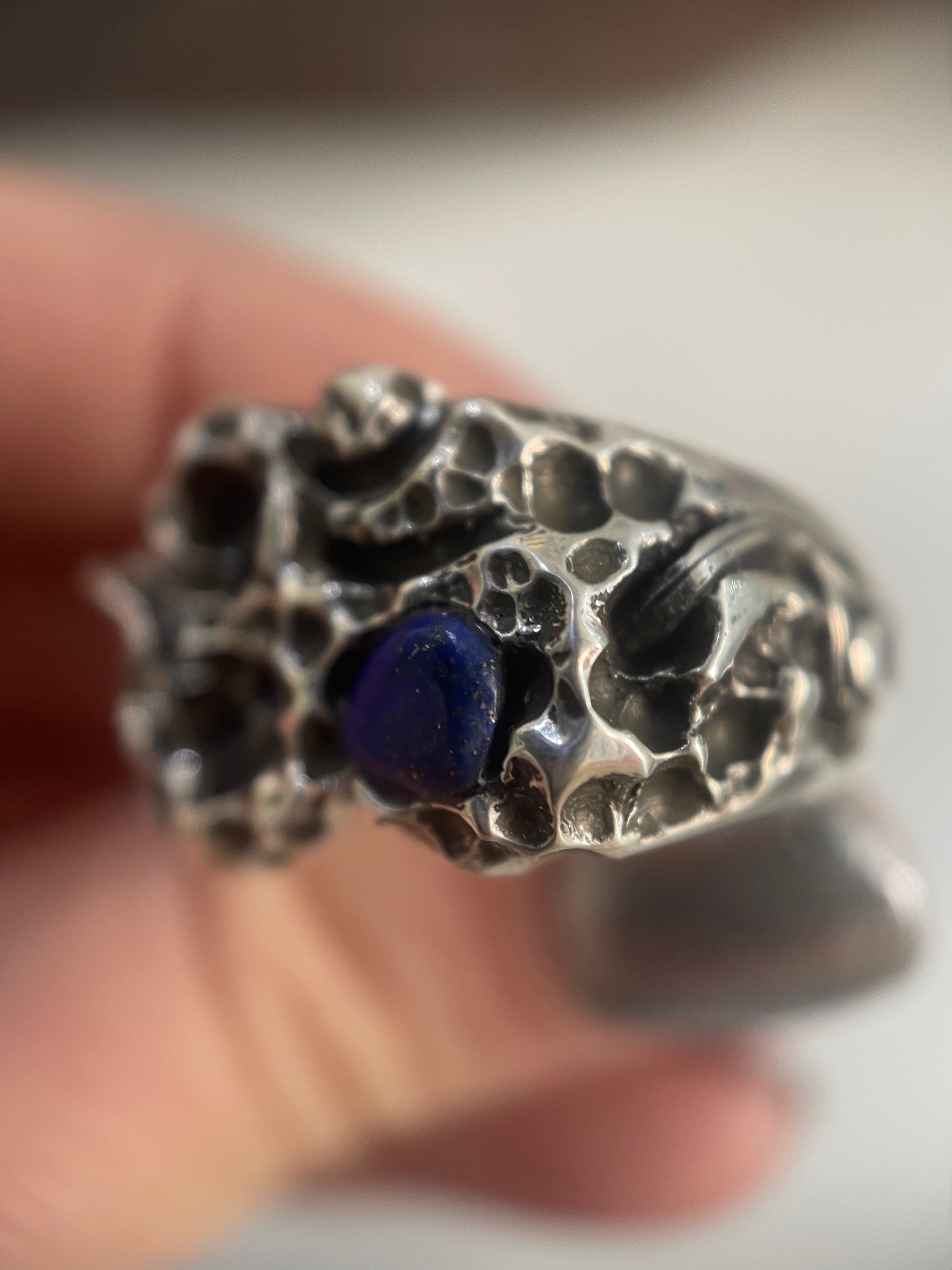Made of solid 925 Sterling Silver and Lapis. Due to the Lapis Stone being set, this piece cannot be resized and comes in a standard US 10.5 or UK V.