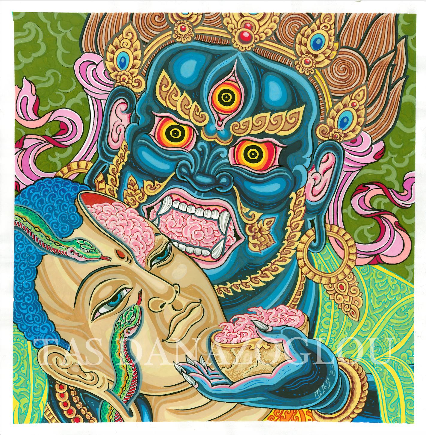 The work draws inspiration from Tibetan iconography of Mahākāla, the fierce guardian and destroyer of obstacles, reimagined through Tas Danazoglou’s distinctive style. A powerful fusion of ancient symbolism and contemporary vision, the piece embodies protection, transformation, and the triumph of light over darkness.k