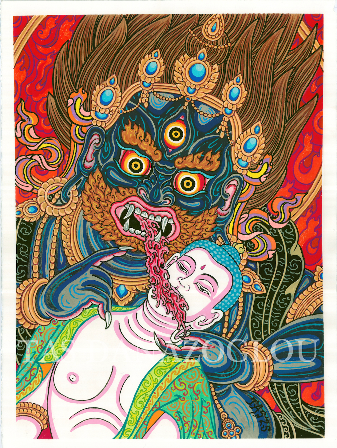 The work draws inspiration from Tibetan iconography of Mahākāla, the fierce guardian and destroyer of obstacles, reimagined through Tas Danazoglou’s distinctive style. A powerful fusion of ancient symbolism and contemporary vision, the piece embodies protection, transformation, and the triumph of light over darkness.